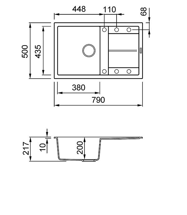 Integrovaná oblast pro příslušenství v odkapávači, vybavená předvrtanými otvory, které vám umožňují instalovat doplňky: excentrické ovládání odpadu, dřezovou baterii s vytahovací sprchou a dávkovač saponátu.