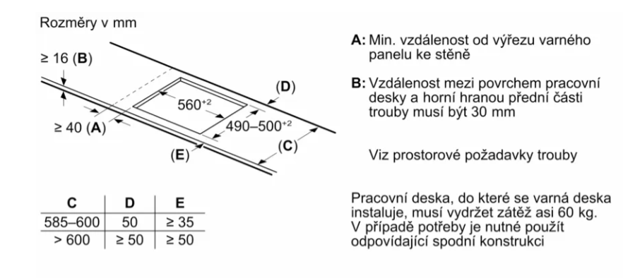 Požadovaná velikost otvoru pro instalaci (v x š x h)