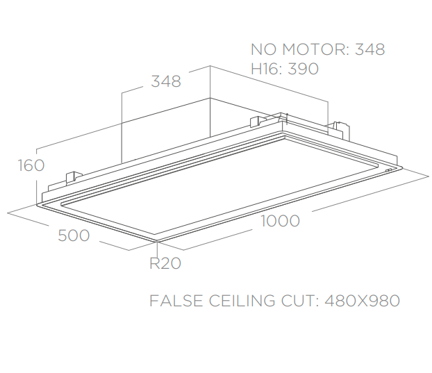 ELICA ILLUSION NO MOTOR @ je stropní odsavač par (digestoř) navržený designérem společnosti ELICA FABRIZIO CRISA . ELICA ILLUSION je vyroben z bíle lakovaného rámečku + bíle lakovaný středový panel. Dálkové ovládání je součástí balení. Samozřejmostí je signalizace nutnosti čištění tukových a uhlíkových filtrů.